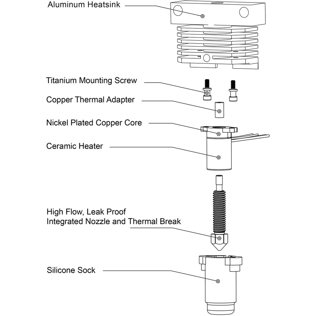 The FlowTech Hotend consists of a permanently sealed assembly of a nozzle and thermal break. This leak-proof design ensures that no print is ruined or material wasted by a leaky nozzle.