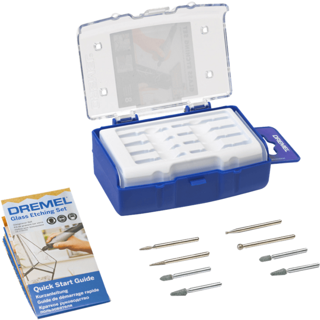 This glass engraving kit from Dremel offers you a range of accessories for engraving and etching glass (and metal). The high-quality accessories are housed in a practical carrying case for organised storage.