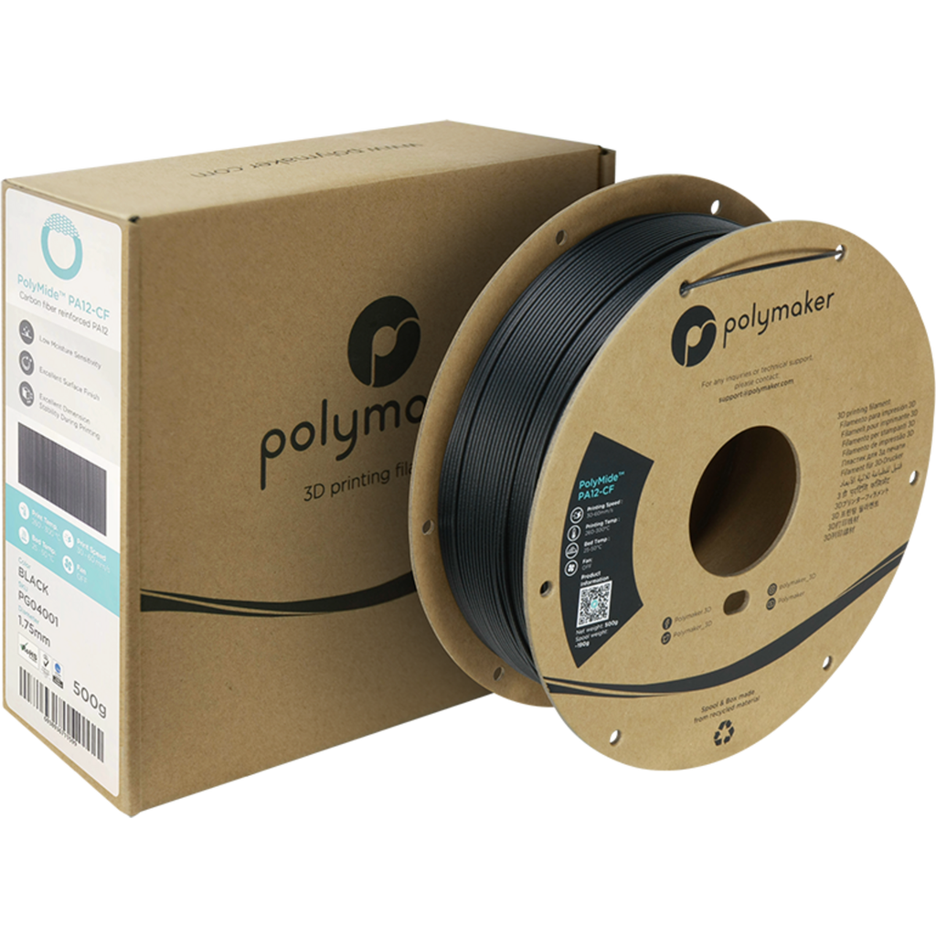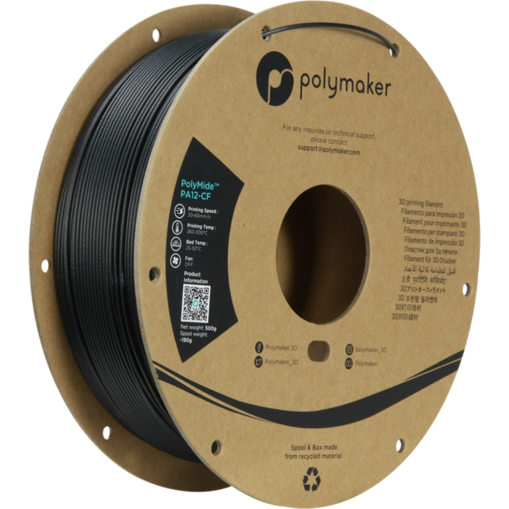 Polymide PA12-CF is a carbon fibre reinforced PA12 filament (nylon).