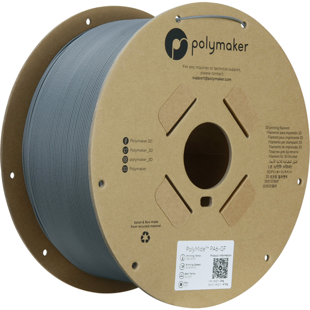 PolyMide ? PA6-GF is a glass fibre reinforced PA6 filament (nylon 6). The material has excellent thermal and mechanical properties without affecting the layer adhesion.