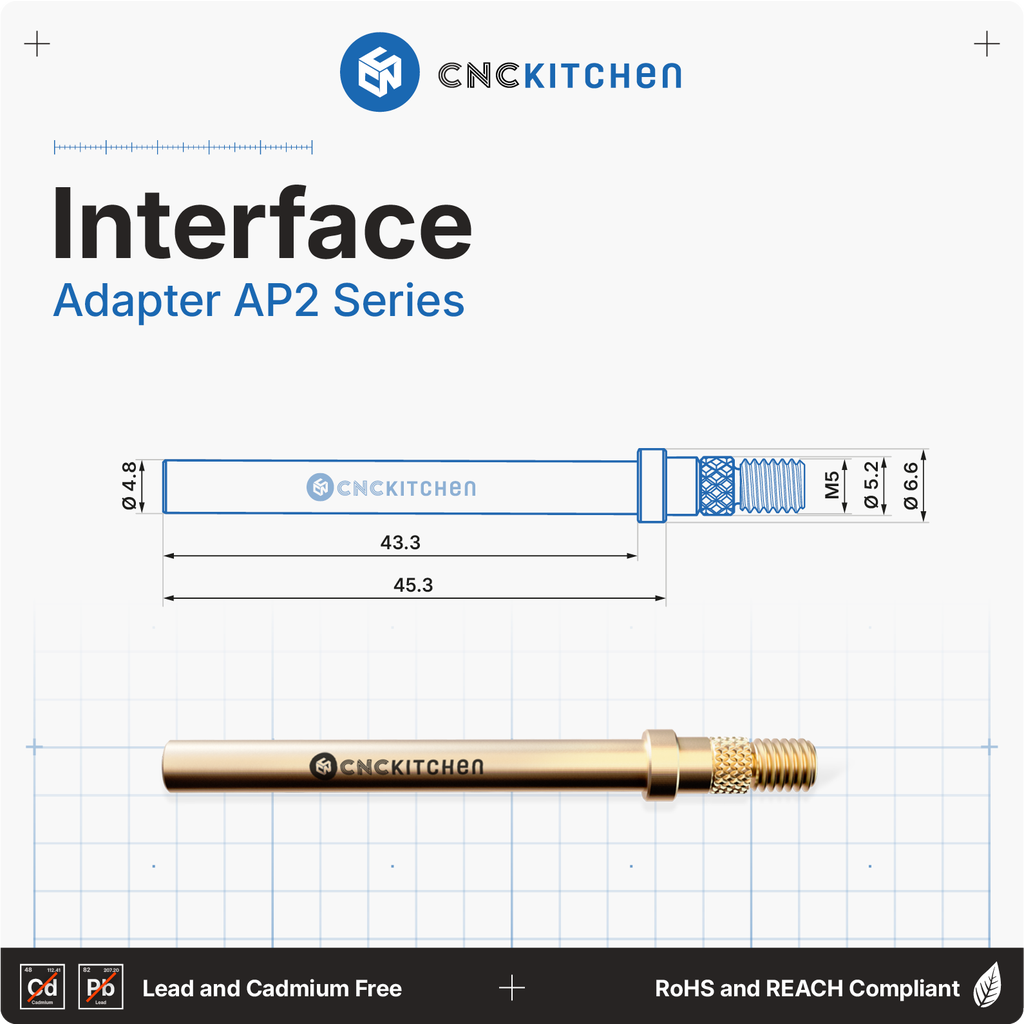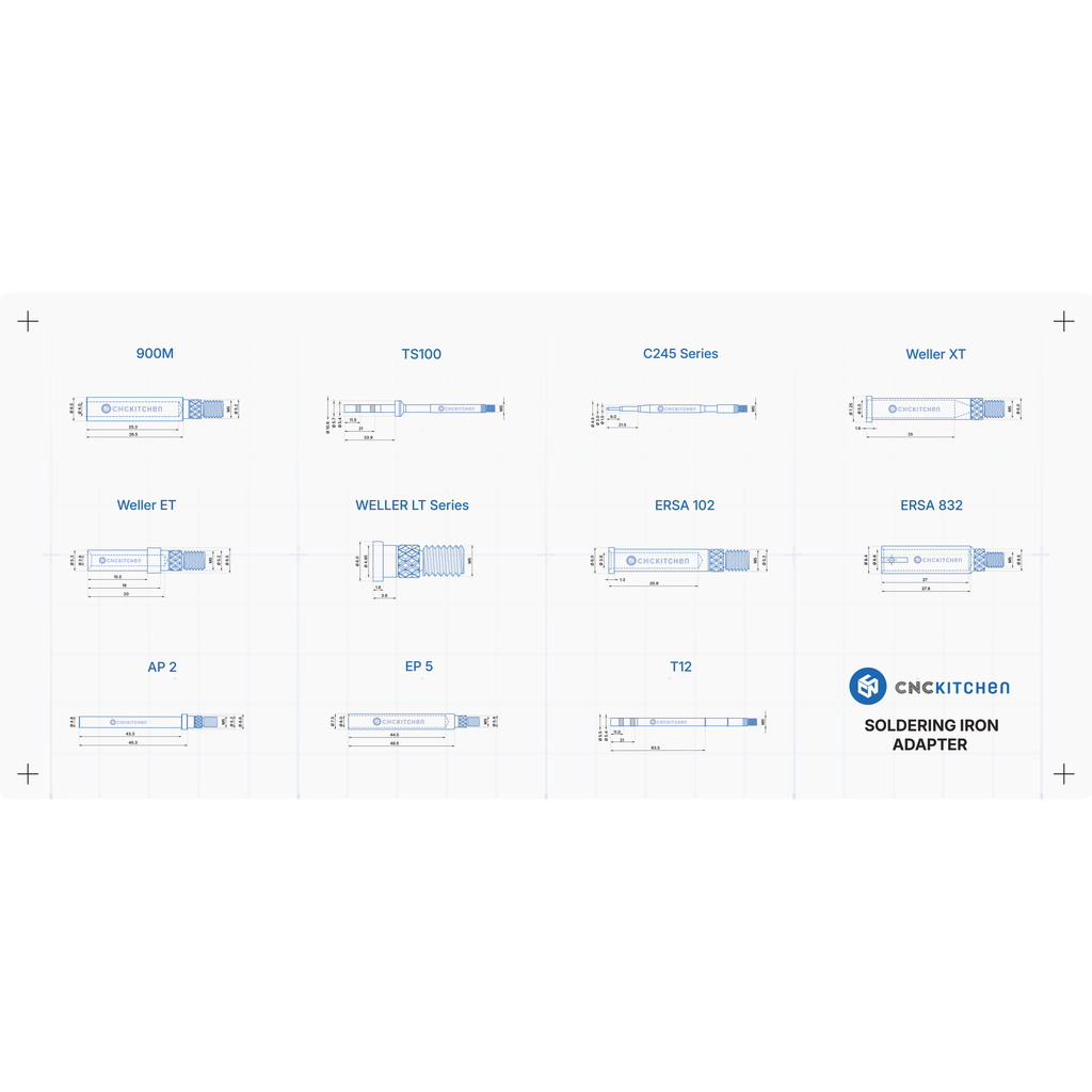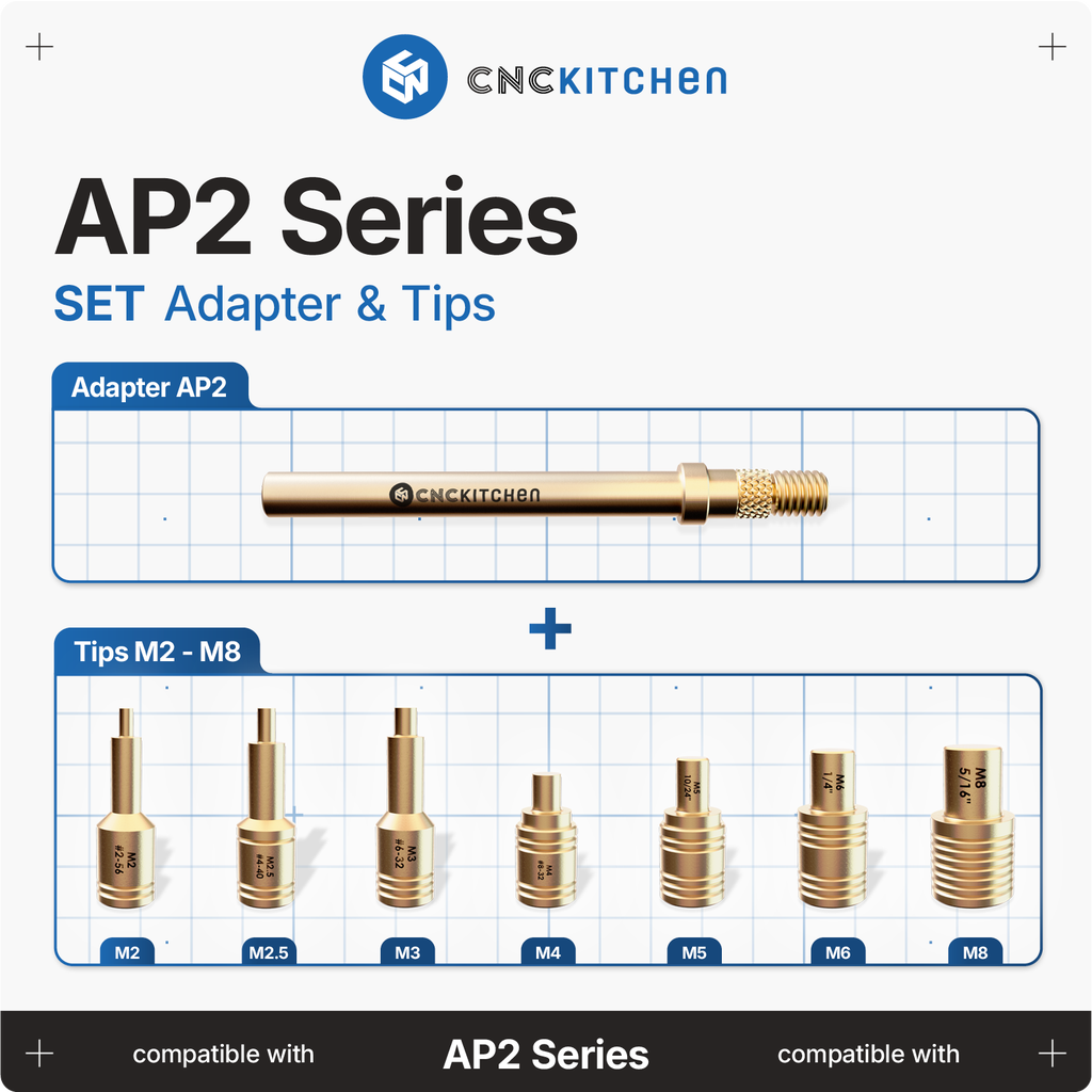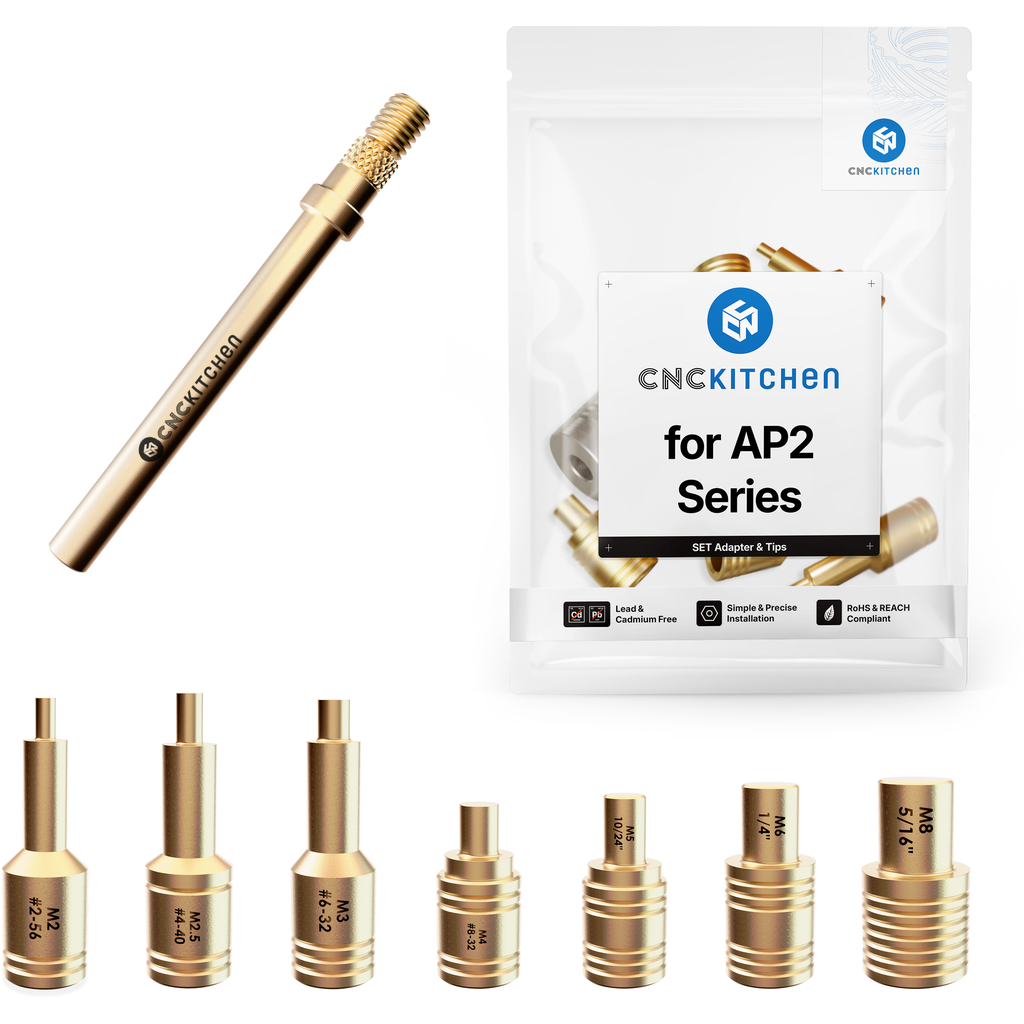The soldering tips are compatible with AP2 standard soldering irons and are perfectly matched to CNC Kitchen threaded inserts. They feature laser markings and notches for easy size identification. REACH-compliant.