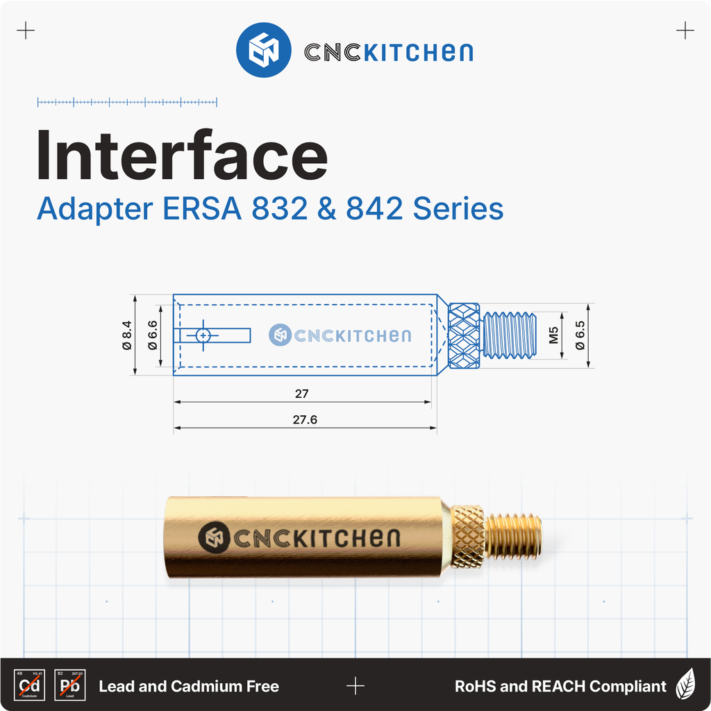 The soldering tips are compatible with ERSA ERGO TOOL, MULTI-PRO, MULTI-SPRINT, MULTI-TC, PTC 70, and POWER TOOL soldering irons, and are perfectly matched to CNC Kitchen threaded inserts. They feature laser markings and notches for easy size identification. REACH-compliant.