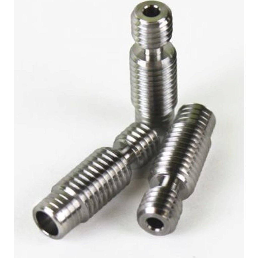These high-quality titanium heat breaks are an upgrade of the stainless steel heat breaks that are included as standard with E3D V6 hot ends. Since V5, the manufacturing processes for all E3D HeatBreaks have been revised in order to achieve a better internal surface quality than ever before. The improved internal surface finish helps to reduce the extrusion force and improve reliability during retractions. They are able to provide reliable high temperature performance for many years, but are somewhat more sensitive due to their fine machining.